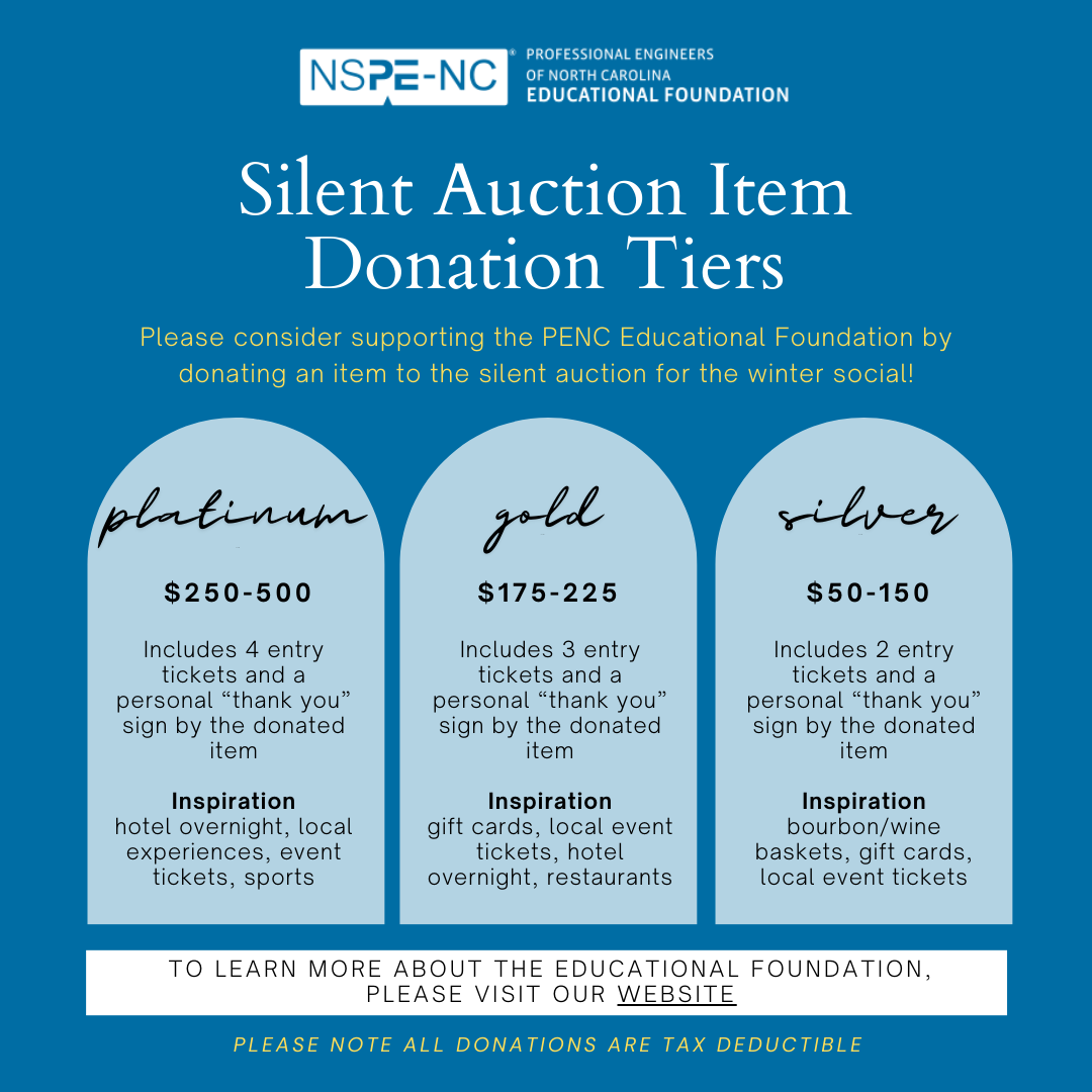 The PENC Educational Foundation works to fund STEM competitions geared towards middle school students and provides scholarships to students studying various engineering majors in North Carolina. We help organize, promote and fund two major competitions in North Carolina – MATHCOUNTS, a national math competition, and the Future City competition. To learn more about our work, please visit our website. To help fund these programs, we are planning a Winter Social and Silent Auction to raise money for our 2026 activities. Each ticket to the event will include two drink tickets, access to the silent auction, and light snacks.