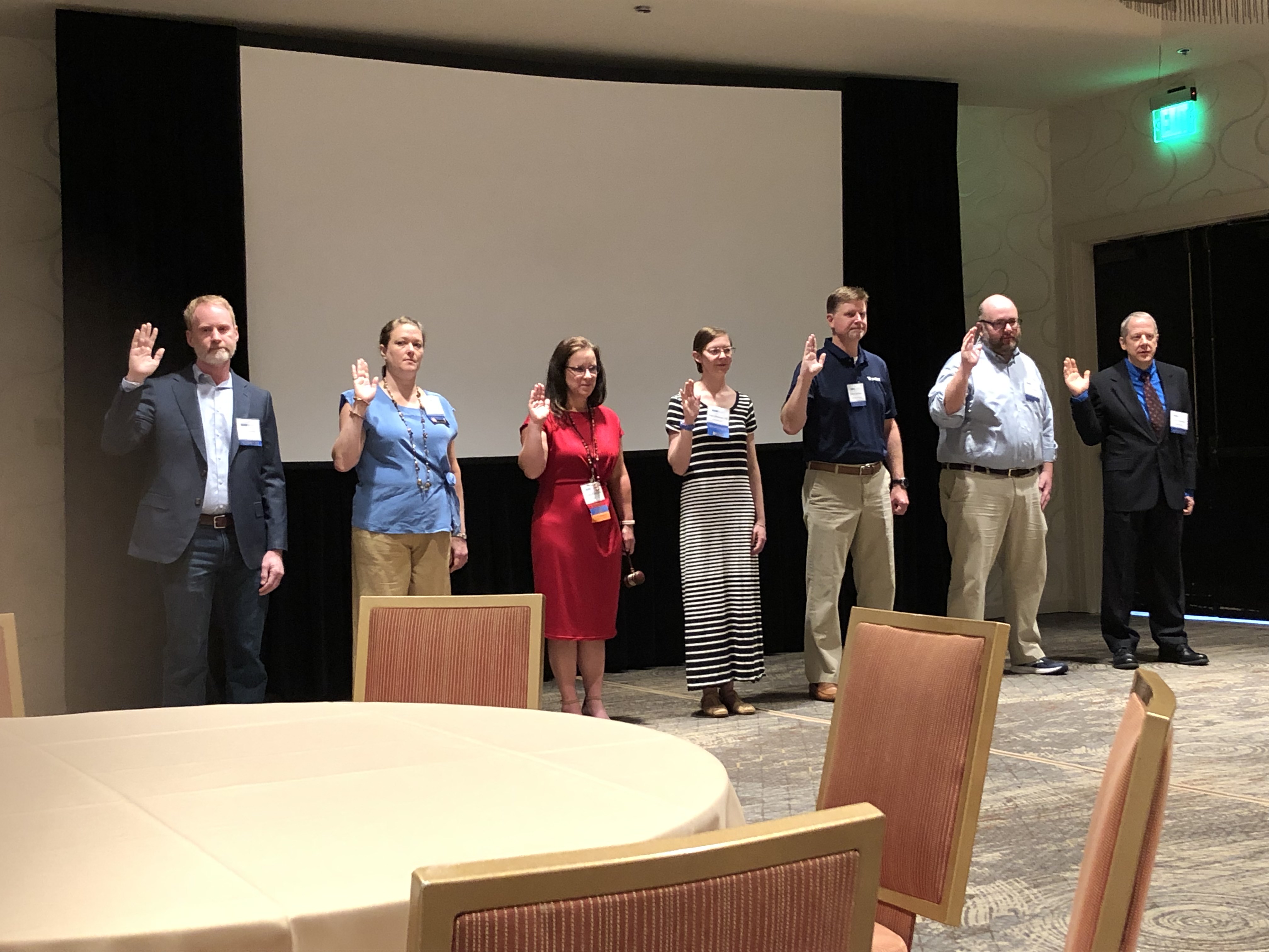 Pictured above: Scott Stamey, PE (President), Scarlett Kitts, PE (President-Elect), Monica Fulkerson, PE (Past President), Kristin Brickman, PE (Secretary), Brian Johnson, PE (Director), Andrew Burton, PE (Director), James Chandler, PE (Director). Not pictured: Derrick Smith, PE (Treasurer) and Srijib Mukherjee, PE (NSPE Delegate)